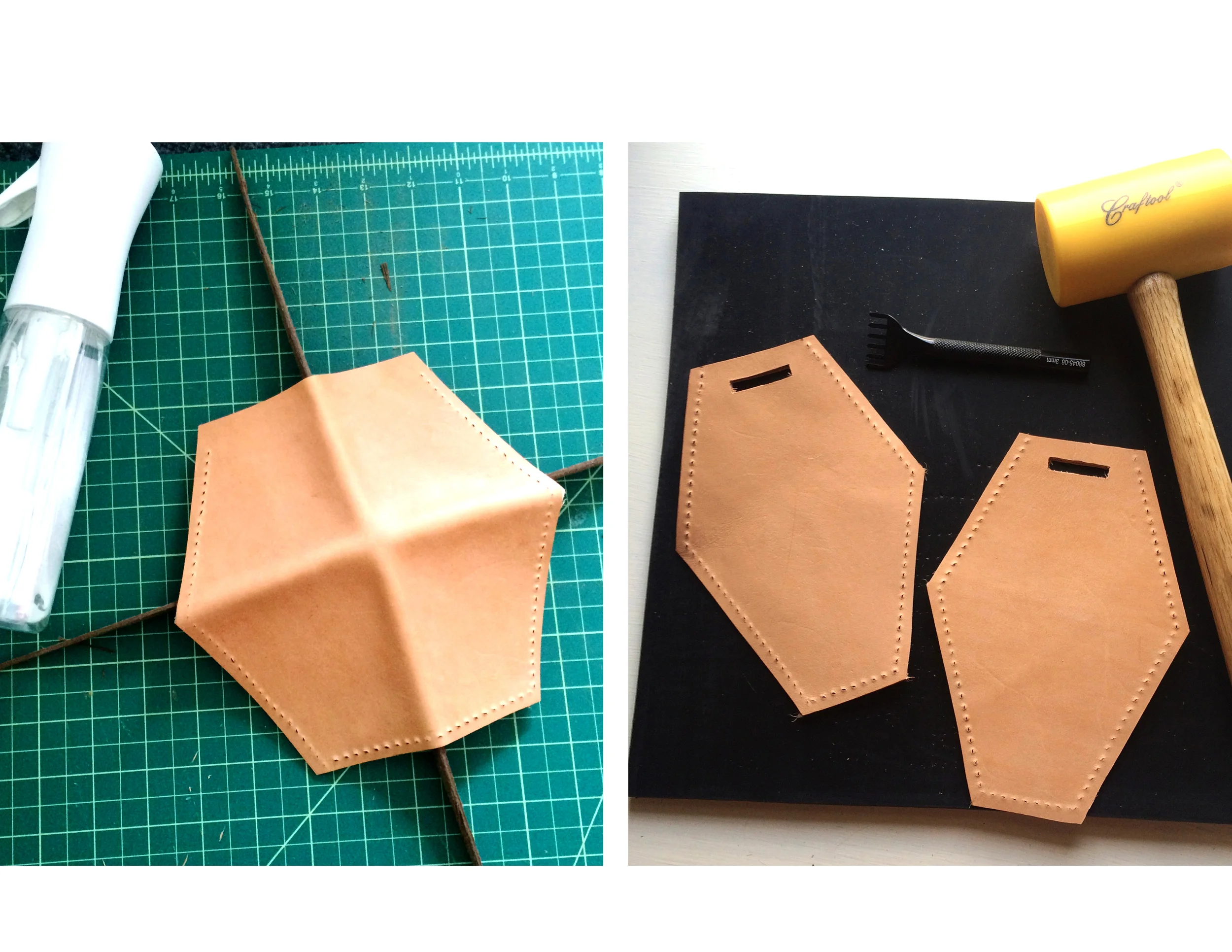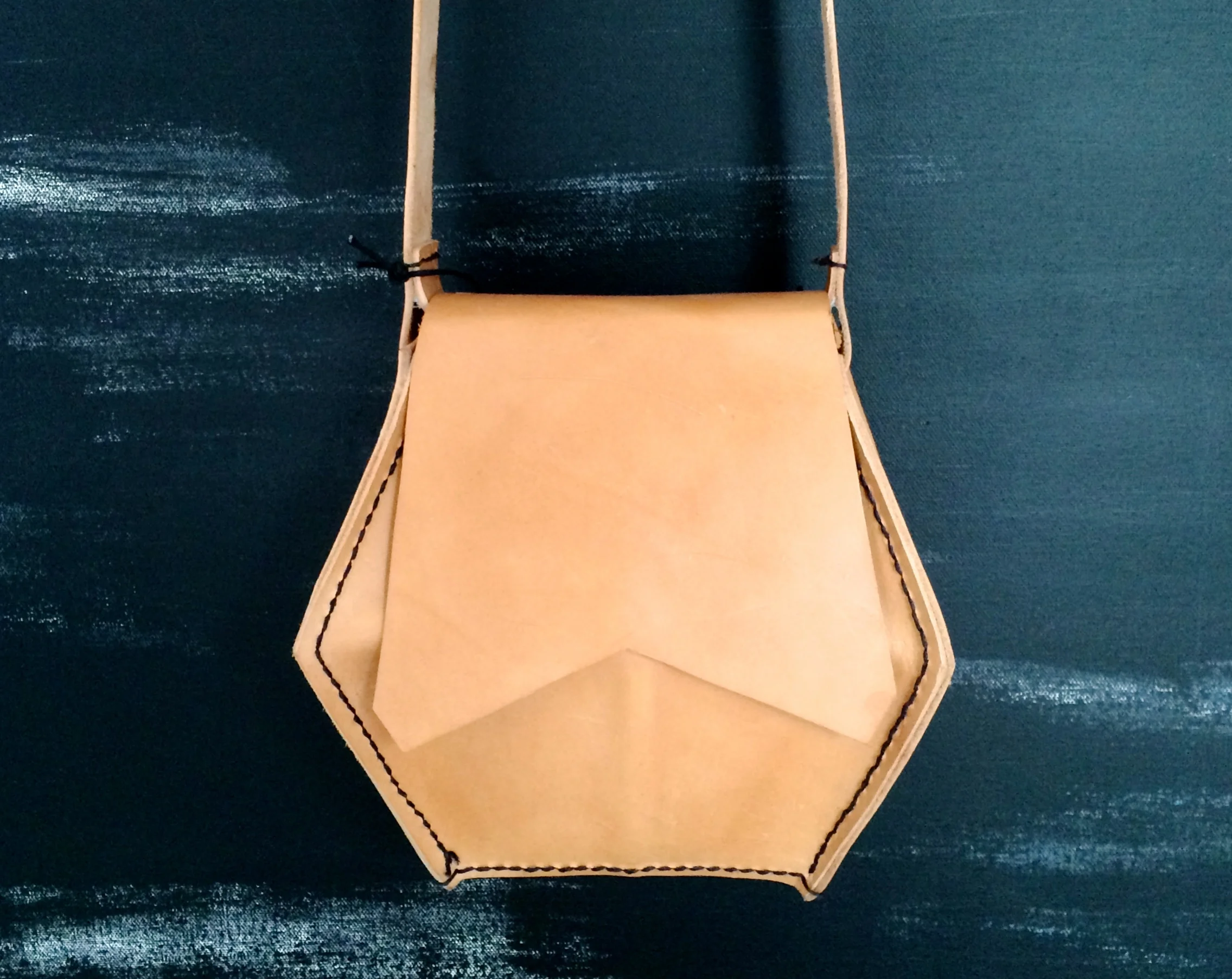 At its core, sanguinity embodies celebrating life in the moment and a spontaneous spirit. Simple, functional, and versatile, these bags carry only what you need, allowing for endless adventure and moments well spent. While minimalist in shape, they are not shy of detail or design, letting our customer feel good about what she wears, all while looking fashionable and enviable. Inspired by natural formations in nature, this specific piece is hexagonal in shape (thanks to wet forming), is comprised of natural veg-tanned leather, and is hand-stitched together using waxed linen thread. "