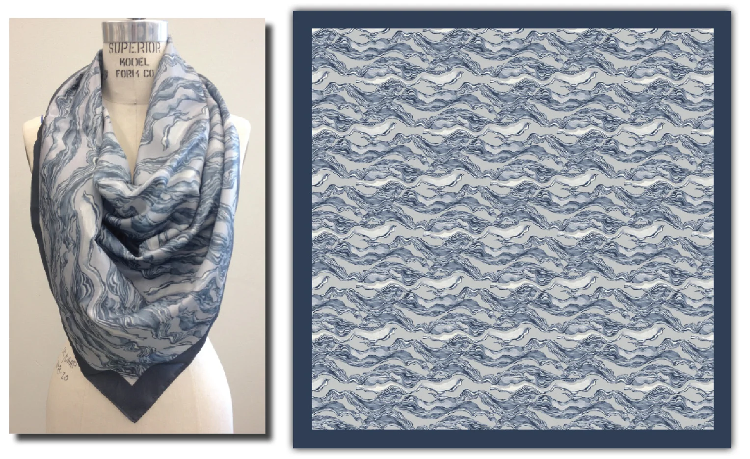 Inspired by organic impressions of water + ice, this original print reflects skills developed in Kaledo. Other elements of this project included a weave and a knit, as well as conceptual research + accompanying flats.